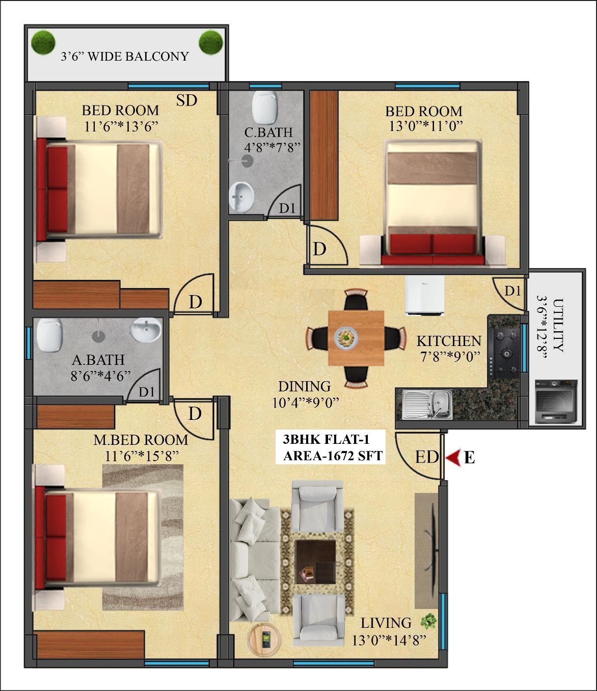 1 | 1672 Sft | East | 3 BHK |
