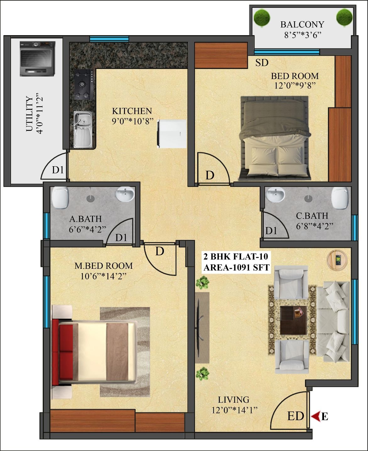 10 | 1091 Sft | East | 2 BHK |