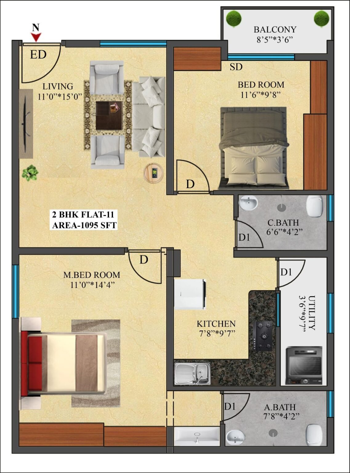 11 | 1095 Sft | North | 2 BHK |