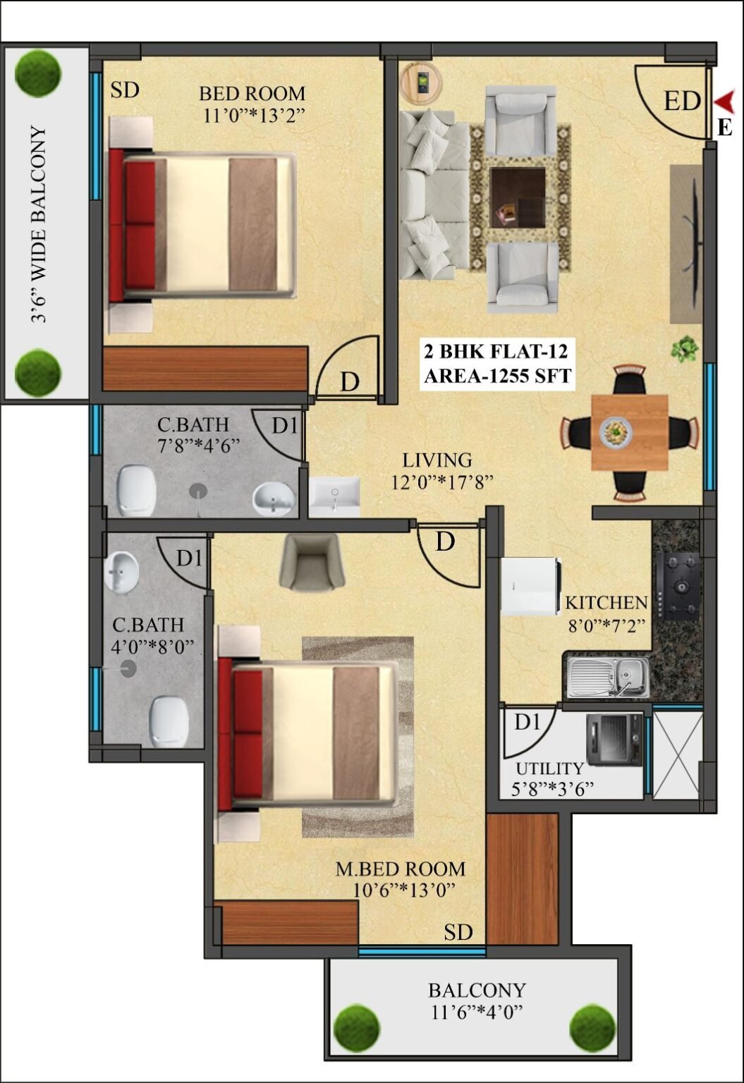 12 | 1255 Sft | East | 2 BHK |