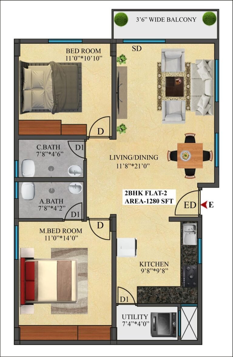 2 | 1280 Sft | East | 2 BHK |