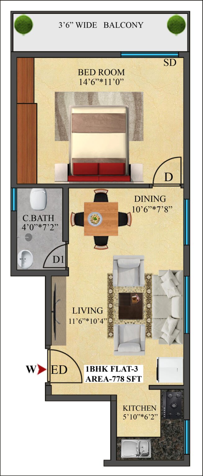 3 | 778 Sft | West | 1 BHK |