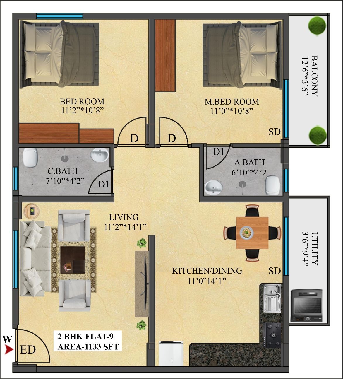 9 | 1133 Sft | West | 2 BHK |